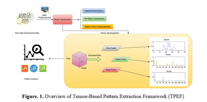 Analyzing big data sets can be difficult due to their intricate patterns and concealed connections.to decrease complexity while retaining essential details necessary for identifying significant trends from this data type. The precision for pattern identification and classification in data with many dimensions, the current study aims to establish a Tensor-Based Pattern Extraction Framework (TPEF). The suggested system employs an organized preparation method to deal with missing values, remove duplication, and standardize the data representation for uniformity. A multi-way tensor can represent the connections among objects. To enable the recognition of noteworthy structures, tensor factorization procedures are used to break down the tensor into lower-dimensional elements. Grouping elements with identical features through methods of clustering improves their comprehension. More exact grouping and data representations are made possible by the test results showing that TPEF increases the effectiveness of sequence extraction. The findings demonstrate that data can be better organized using tensor breakdown, which improves computational effectiveness without losing essential information connections. As an adaptable option for different analytical tasks, the present research shows that tensor-based techniques effectively discover undetected patterns in high-dimensional information.