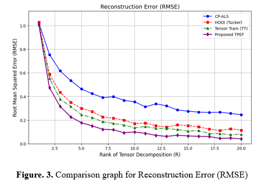RMSE evaluates how well the deconstructed tensor recreates the information in the file. The median square variance of the initially generated tensor quantities and the factorized numbers are calculated. A smaller RMSE suggests faster segmentation and less data loss. For tensor factorization ranking decisions, preserving significant connections with minimal distortion in recovered structures is crucial. RMSE is employed in the compression of information, modelling for prediction, and processing of signals to maintain information consistency.