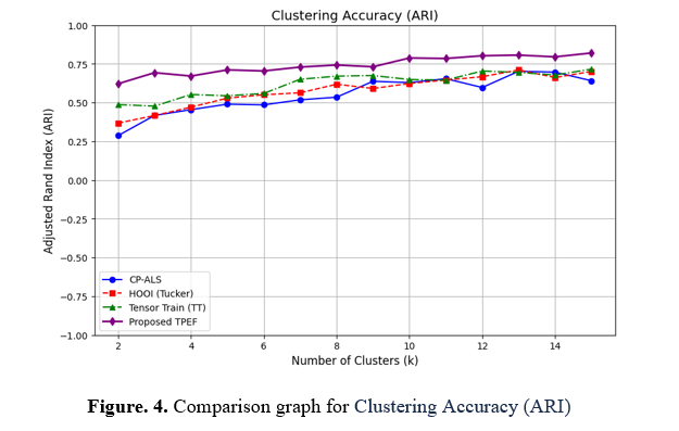 This program plots Clustering Accuracy (ARI) vs. Number of Clusters (k) for CP-ALS, Tucker (HOOI), Tensor Train (TT), and the recommended TPEF algorithm. A collection of Original Names and Common Name combinations is used for classification. They are linked by mapping each original name to its common name. How every algorithm clusters comparable names, the program replicates clustering accuracy (ARI) for numbers ranging from 2 to a customized maximum k_max. The ARI numbers of the dataset's tensor interpretations are used to evaluate segmentation effectiveness, and more significant ARI numbers suggest more excellent grouping. The application utilizes simulated information for ARI and produces a horizontal plot that illustrates the statistical efficacy of every tensor-splitting method in gathering comparable names and recognizing similarities in the analyzed data.
