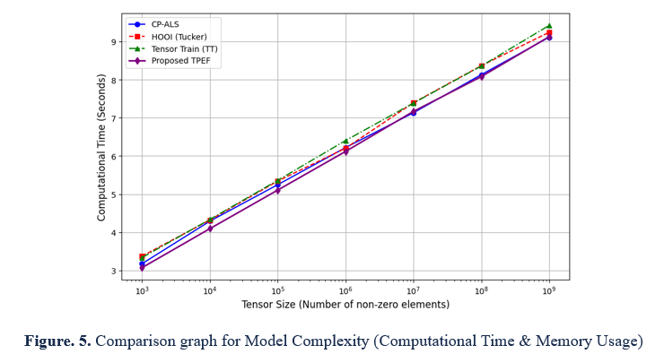 The application generates a chart that contrasts the computational time for CP-ALS, Higher-Order Orthogonal Iteration (HOOI), Tensor Train (TT) Decomposition, and the Proposed Tensor-Based Pattern Extraction Framework (TPEF) depending on the tensor dimensions. The database contains pairs that include the initial and common names, such as "111th Congress" transferred to "111th Congress" and "bin Abd al-Aziz Al Saud, Abdullah" translated to "Abdullah bin Abd al-Aziz Al Saud," indicating connections among entities. The following program demonstrates how every deconstruction technique manages growing tensor dimensions (exponentially spaced from 10^3 to 10^9). Tensor size (greater than zero components) is displayed on the x-axis, while the computational duration (in seconds) is on the y-axis. The line graph shows how well each approach expands with information dimension, comparing massive amounts of Decomposition of Tensors performances.