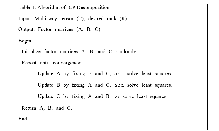 Two parameters are required to specify the desired decomposition number: the multi-way tensor (T) and the rank (R). Matrix initialization: The matrices A, B, and C are initially set to a random value. The third matrix is updated by solving a least-squares problem during each iteration, while two matrices are fixed. This process continues until the reconstruction errors converge when no more changes occur. The factor matrices (A, B, C) represent the decomposed tensor components as output.