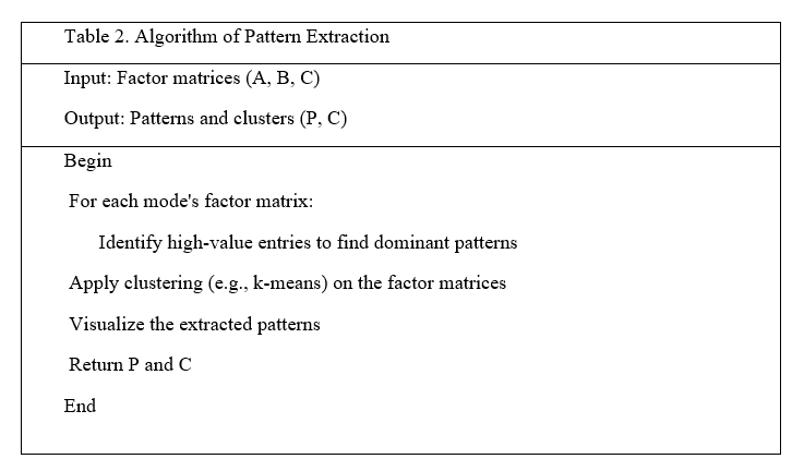 The suggested Tensor-Based Pattern Extraction Framework (TPEF) achieves efficient pattern recognition and categorization to simplify complex information while maintaining essential connections. Despite sacrificing critical relationships, findings show that decomposing tensors increases computational effectiveness and enhances information organization. The design improves the understanding of retrieved patterns by incorporating clustering methods, making it an invaluable instrument for many analysis applications. Improving the structure in future versions can include adding support for volatile datasets that necessitate ongoing tensor factorization for real-time updates. Advanced optimization techniques can be integrated to decrease computational difficulty further and improve scalability. Combining deep learning algorithms with tensor-based methodologies could enhance pattern identification and automatic decision-making in significant data settings.