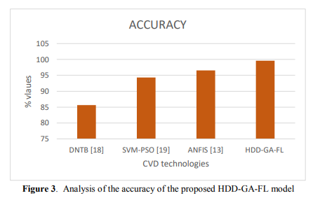 One essential statistic for assessing the effectiveness of classification models, such as the HDD-GA-FL model for heart disease diagnosis, is accuracy. It shows the percentage of instances in the dataset that have been accurately classified out of all cases. The accuracy metric gives an overall assessment of the model's prediction performance. A model with a higher accuracy value performs better because it correctly identifies a more significant percentage of examples.