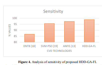 A critical performance indicator for binary classification models, such as the HDDGA-FL model used to diagnose heart disease, is sensitivity, sometimes called the actual positive rate. It measures the model's accuracy in identifying heart disease patients among all positive instances in the dataset. The percentage of accurate positive results the algorithm accurately classifies as positive is known as sensitivity. Stated differently, it assesses the model's capacity to identify coronary artery disease among people with the illness.