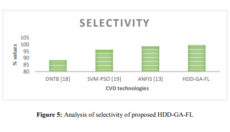 The HDD-GA-FL model's accuracy (Figure 3) indicates how well it can diagnose heart disease compared to conventional diagnostic techniques. The model seeks to overcome the difficulties presented by the ambiguity and complexity of coronary artery disease diagnosis by combining the skills of fuzzy logic classifiers and genetic algorithms to effectively categorise instances based on complicated medical data.