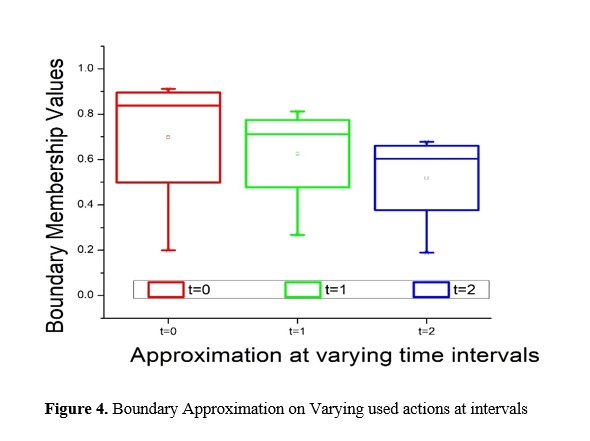 The circumstance in Equation (3) is shown to be more realistic as a result of the implementation of a fuzzy indiscernibility relationship, which gives 〖FRS〗_b (i,j), and it has been observed that the boundary region for both groups appears to be more disordered. That is, different behaviours are taken into consideration, but it consistently tends to reduce its cardinality without decreasing to zero.