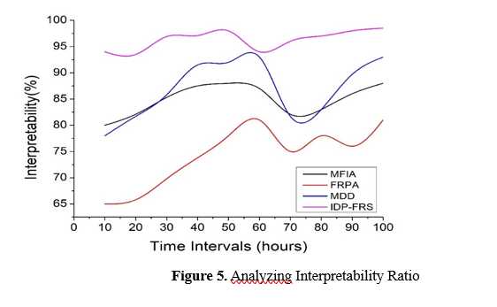 Evaluation factors such as the number of rules, the degree of complexity of rule structures, and the readability of rule formulations are taken into consideration. After that, the score for interpretability is determined for every FRS model or set of rules by adding up the scores that were allocated to the various interpretability variables. For the purpose of making comparisons between other models or datasets easier, this score is normalized to a scale that has been in place for some time. Lastly, the interpretability ratio is calculated by multiplying the standardized interpretability rating by the total accuracy of predictions or performance indicators of the model. This method is used to determine the interpretability ratio. A larger interpretability ratio implies that the framework is more interpretable in comparison to its performance. This provides important insights into the relationship that exists between the interpretability of the model and its prediction accuracy. Researchers can make educated judgments on model selection and deployment by utilizing FRS theory to compute the interpretability ratio. This helps to ensure that the predictive models successfully balance comprehension with prediction effectiveness in the setting of information disorder detection interpretability, which is illustrated in Figure 5.
