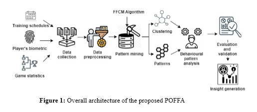 . Collecting information for the planned POFFA requires obtaining a wide range of data from numerous important sources for female athletes in many sports. Collecting data for the POFFA requires gathering extensive information such as performance measures, practice timetables, player physical measurements, game data, and related factors. Metrics include many elements such as time, distance, accuracy, power, and technical skills. Training schedules outline the sorts of sessions, their intensity, and how often they occur. Biometrics include height and weight measurements, body composition, cardiovascular variability, and biomechanics. Game statistics include player and group performance, match results, and conditions. Other elements, including psychology, dietary habits, injuries, and the environment, could also be considered. It's important to ensure that the data is accurate, covering a variety of sports groupings and female players, to provide helpful coaching and training plans. Figure 1 shows the overall architecture of the POFFA framework.