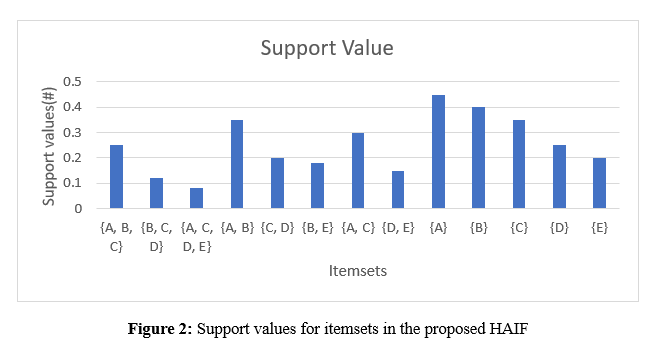 The figure 2 shows that support values help with pattern recognition, clinical choice-making, and quality improvement by providing information about the frequency of health events or item combinations in healthcare datasets. They act as analytical resources for figuring out illness trends, treatment regimens, and patterns of healthcare use. In line with enhancing patient outcomes, optimizing resource use, and resolving healthcare inequities, the content highlights the practical significance of support values in healthcare analytics, which is essential for well-informed decision-making and management.