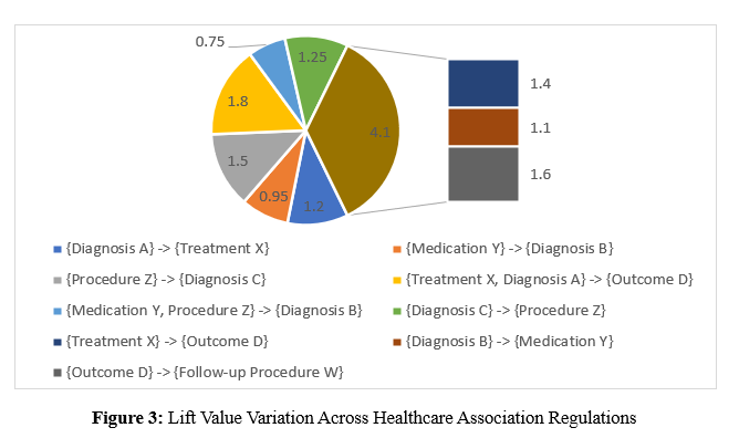 Figure 3 shows several association rules and their accompanying lift values obtained from healthcare datasets. The lift values indicate the strength and importance of correlations between healthcare-related factors or occurrences. If the elements occur together more often than expected, a lift value more than 1 indicates a positive relationship, whereas a lift value less than 1 indicates a negative or neutral relationship.