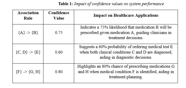 In the healthcare industry, confidence values support treatment planning, allocation of resources, clinical decision-making, and quality improvement. Based on patterns in the data, they represent the probability of certain events or courses of action. Although this data is organized in Table 1, its practical application necessitates clinical knowledge and careful interpretation to maximize patient care and the organisation's efficiency.