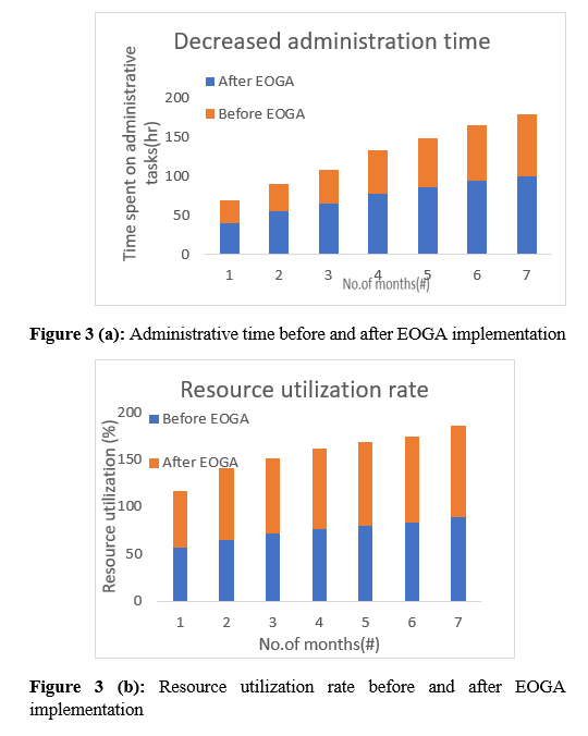 Figures 3 (a) and 3 (b) visually show how school administration efficiency has improved by using EOGA. Educational institutions can evaluate how well the algorithm improves administrative processes and boosts operational efficiency by analyzing data before and after EOGA is implemented. Educational institutions can evaluate the concrete enhancements in administration efficiency achieved via EOGA by examining these measurements and assessing the outcomes. These measurements offer useful information on how well EOGA is improving administrative procedures and increasing overall operational effectiveness.