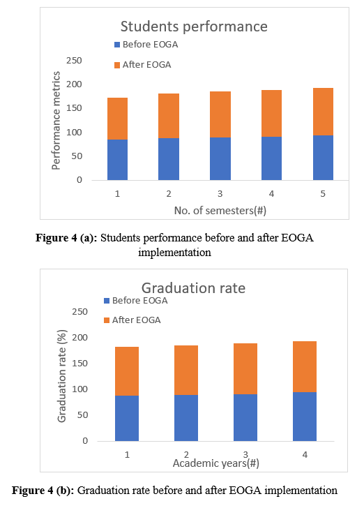 Educational institutions can evaluate the effects of enhanced school administration processes with EOGA support on student achievement and graduation rates by analyzing points of data before and after EOGA deployment as shown in figures 4 (a) and 4 (b) respectively. Educational institutions can assess the effects of improved school administration procedures using EOGA by examining these measurements and their related formulas on educational results. These evaluations offer important information about how EOGA impacts student performance, rates of graduation, and overall academic success.