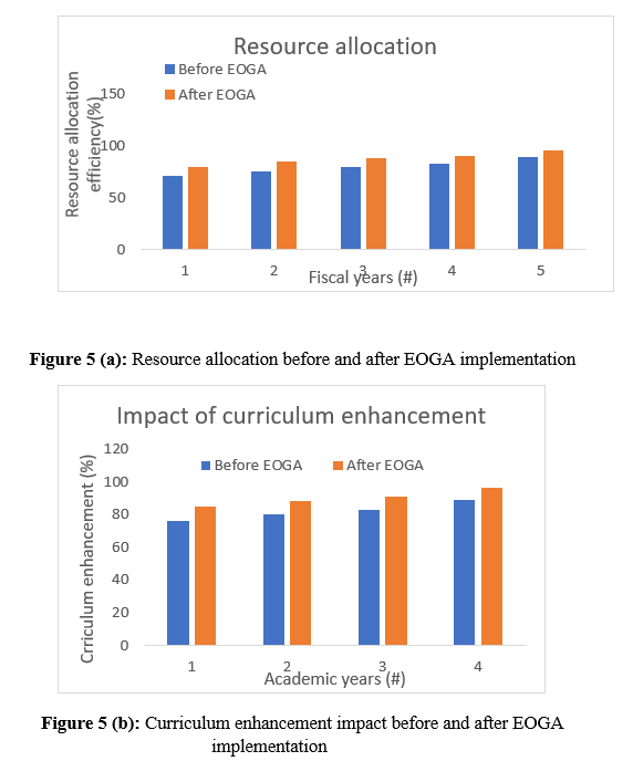 Figures 5 (a) and 5 (b) shows that the educational institutions can assess how EOGA supports data-driven decision-making in different educational areas by examining these equations and indicators. These evaluations include information about how well data is used to guide decisions on distributing resources, improving the curriculum, and supporting students, resulting in more successful and influential educational methods. Educational institutions can evaluate the influence of EOGA on data-driven choices in resource allocation and curriculum improvement by analyzing information points before and after EOGA adoption.