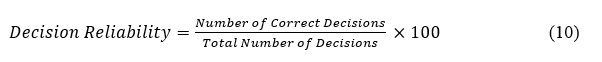 Decision reliability is the system's capability to make consistent and correct decisions under changed conditions. It is the proportion of the number of correct choices against the total number of actions that should align with optimal outcomes. Equation (10) can achieve this.