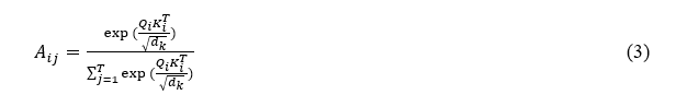 Self-Attention Mechanism: Calculate attention weights to capture relationships between all-time steps (equation (3)):