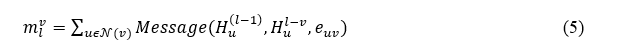 In the above equation (5), m_l^v: Message aggregated for node v at layer l. N(v): neighbouring nodes of v. e_uv: Edge features between u and v.