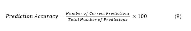 Prediction Accuracy is the basic measure of any model's performance. It relates to the ratio of proper predictions regarding outcomes to the total number of predictions. Prediction accuracy can be obtained from Equation (9).