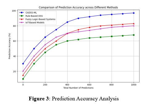 Figure 3 shows the prediction accuracy analysis of the proposed method. The graph of prediction accuracy demonstrates that the CADSS-ML method outperforms all existing models. CADSS-ML is superior to others because its meta-learning framework can quickly adapt to dynamic conditions and utilize the power of deep learning models like CNN, transformers, and GNN. While Rule-Based DSS, Fuzzy Logic, and IoT-based models cannot handle data heterogeneity and adaptability, the prediction accuracy is lower and more static than CADSS-ML, making CADSS-ML more reliable in diverse contexts.