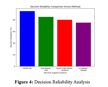 Figure 5 shows that the CADSS-ML method consistently outperforms other models regarding reliable decisions. The CADSS-ML, with reinforcement learning, reward shaping, and context-aware features, will adapt faster to changing environments and, hence, be more dependable in decision-making. On the other hand, Rule-Based DSS, Fuzzy Logic, and IoT-based models face uncertainty and lack adaptability, often resulting in less reliable decisions in dynamic contexts. The ability of CADSS-ML to handle heterogeneous data and generalize to new situations enhances its decision reliability.