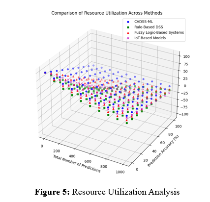Figure 4 shows that the CADSS-ML method outperforms the existing models. Due to the utilization of federated learning in CADSS-ML, resource usage will be optimized by ensuring data privacy and effective data sharing across sensor nodes, avoiding heavy centralized processing. This also uses meta-learning algorithms that adapt quickly to new tasks, improving resource efficiency. Contrasting these, Rule-Based DSS, Fuzzy Logic, and IoT-based models tend to be more resource-intensive because of the central computation involved and lack of adaptive learning; thus, they use resources less optimally.