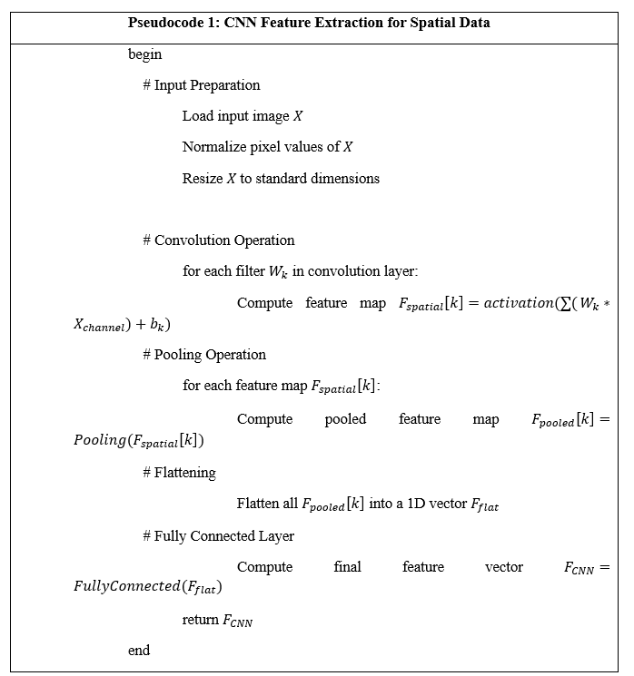 The pseudocode-1 effectively captures CNN operations, where the process flows from input preparation through feature extraction and transformation. It underlines key processes for capturing spatial features through convolution, pooling, and flattening. Therefore, the structured flow adopted herein is consistent with theoretical conceptualization and is robust and suitable for practical application.
