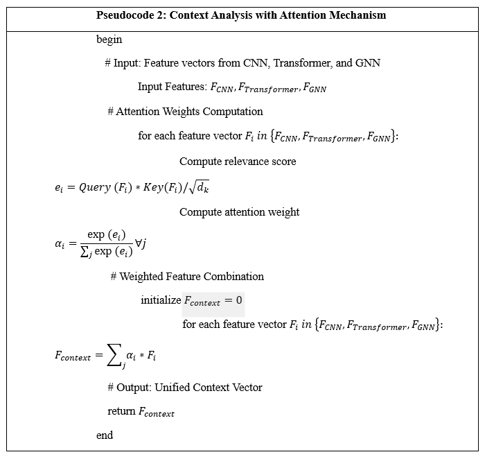 The pseudocode-2 models, in a systematic manner, the process of context analysis: Calculate relevance scores and attention weight for feature vectors, ensuring that critical features are given high dynamic priority. Weight combination unifies the context vector F_context is essential in an adaptive decision-making process. That flow is structured like the principle-theoretical one, hence more exact and scalable.