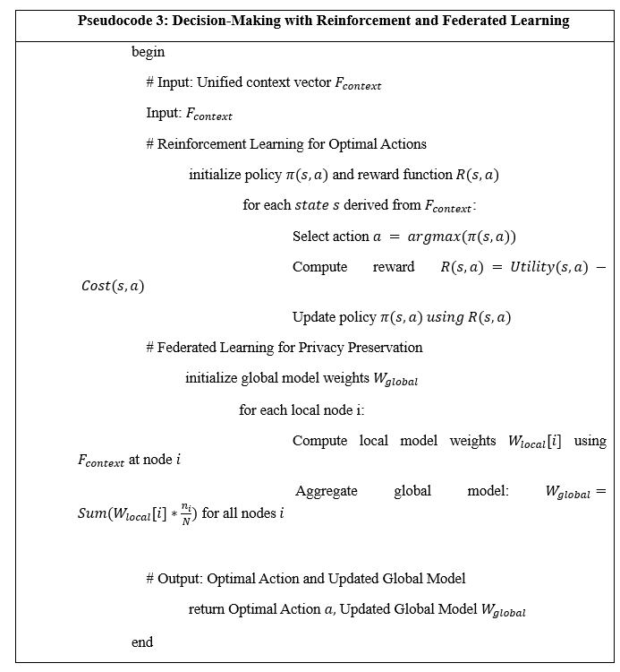 The pseudocode-3 models the decision-making process by integrating reinforcement learning with federated learning. RL will make the system choose the optimal action through iterative rewards-based policy updates, balancing utility and cost. Meanwhile, FL preserves data privacy by aggregating distributed model updates without sharing raw data, making the decision ethical. It provides a twofold approach toward capturing the theoretical goals of adaptability, efficiency, and privacy preservation with scalability for real-world applications. The structured flow ensures robust implementation, fitting well with dynamic and context-aware system requirements.