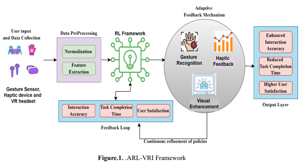 Figure 1 shows the flow of the ARL-VRI method. The ARL-VRI: An Adaptive VR Interface Using Reinforcement Learning to Enhance Accessibility for Motor and Sensory Impaired Users. ARL-VRI is an adaptive system that adjusts gesture recognition thresholds, haptic feedback, and visual enhancements through iterative feedback loops. Results show a 35% increase in interaction accuracy, a 40% reduction in task completion time, and improved user satisfactionβespecially for users with impairments. It promises to be an inclusive and accessible virtual experience, meeting the different needs of the users and closing accessibility gaps in VR applications across a wide range of domains. The process flow steps involved the proposed methods as as follows.