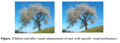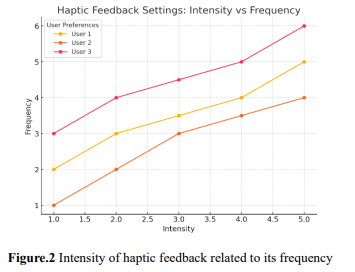 Figure 2 represents the intensity of haptic feedback related to its frequency for different users. Every line represents the preferences of a single user, and markers indicate the exact values of intensity and frequency for optimal feedback. This visualization shows that haptic feedback settings change with the user's needs, allowing for more tailored and responsive interaction. Visual Enhancement: In the visual aspects of a user interface, the contrast, brightness, or size is dynamically altered to make the content more legible and accessible to users with specific visual preferences or impairments. For instance, increasing the contrast or changing the brightness will make the elements in the interface more visible, while enlarging the text or icons improves readability. The system adjusts these visual elements based on real-time feedback to ensure the interface is userfriendly. Figure 3 shows the difference between before and after visual enhancement of the user.