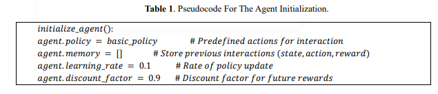 The RL framework for interactive systems requires a few core components to enable agents to learn and improve their user interactions. Agent Initialization The RL agent starts with a basic policy, a pre-defined set of actions to interact with the user. These actions might be mapped to common user behaviours or gestures, giving an initial framework for how the agent responds to inputs. The agent's policy is the starting point of interaction, which will develop as it learns from user feedback. Table 1 shows the pseudocode for the agent initialization.