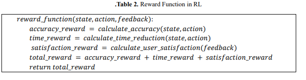 Reward Function The reward mechanism is an integral part of the evaluation of the success of the agent's actions since it dictates how the agent should be rewarded for user interaction. It has a few evaluation dimensions: interaction accuracy, in which the agent gets a positive reward when it correctly interprets the user's inputs (gestures or feedback). Reduction in task completion time, where faster execution of task results in a reward and hence encourages the agent to reduce delays and increase efficiency. User satisfaction metrics, where feedback by the user (satisfaction ratings or haptic responses) is used in the reward function to guide the agent toward user-friendly actions. These combined factors help the agent to optimize its behaviour for better user interactions. Table 2 shows the pseudocode for the reward function in RL