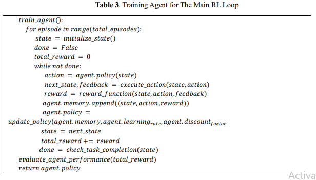 Iterative Learning (Model Training Loop) The RL agent keeps on refining the policy by trial and error. Based on the current policy, it takes an action, and after acting, according to the reward/penalty incurred, updates its policy accordingly. Over time, the agent optimizes its control and sensory outputs concerning acting optimally when dealing with the user. One of the features of an agent is that in iteratively learning in a reward-driven manner learns to adapt a user's preferences and consequently improves interaction quality. Table 3 shows the pseudocode for the training agent for the main RL loop.