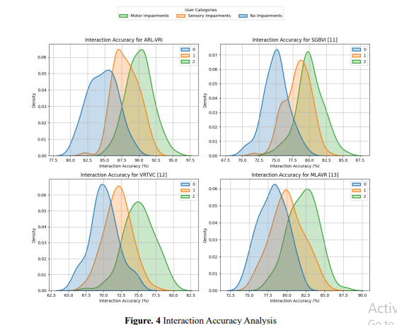 Figure 4 visualizes the interaction accuracy distributions for ARL-VRI, SGBVI [11], VRTVC [12], and MLAVR [13] for the different classes of users: Motor Impairments, Sensory Impairments, and No Impairments. Each subplot shows the results of one method with its density curve highlighted for the different user groups. ARL-VRI has the highest accuracy, demonstrating its adaptability to various impairments. The legend is shown outside the graph and refers to the categories of users. This layout helps compare methods and understand their usability for different user needs.