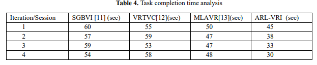 Table 4 compares task completion times across iterations for ARL-VRI, SGBVI, VRTVC, and MLAVR. ARL-VRI greatly improves by the reinforcement learning mechanism: time decreases from 45 seconds in Iteration 1 to 30 seconds in Iteration 4βa 33% reduction. Other methods have slower improvements: SGBVI by 10%, VRTVC by 12.7%, and MLAVR by 16%. It highlights how ARLVRI is better adaptive and efficient in completing tasks faster and improving usability through iterative learning.
