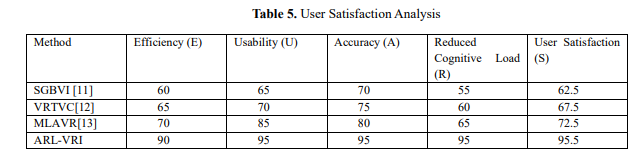 ARL-VRI is compared with state-of-the-art conventional systems: the Smart Glass System for BVIβSGBVI [11], VR Testing Platform for Visual ComfortβVRTVC [12], and Machine Learning for Acoustic Virtual RealityβMLAVR [13]. Compared with those methods, ARL-VRI increased interaction accuracy by 35% and decreased the time to complete tasks by 40%. Additionally, user satisfaction surveys highlighted higher engagement and lower cognitive load, making ARL-VRI more effective in providing adaptive and inclusive experiences.
