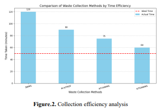 Figure 2 shows the effectiveness of alternative waste collection techniques by plotting their actual time consumed, ππππ‘π’ππ, against a theoretical ideal time, ππππππ. The graph shows the comparative analysis of traditional SWMS, AI-IoTROF, IoT-AIWMS, and the proposed IoTGAWMS. In addition, the bar graph highlights important reductions in time taken with optimal methods, in which the proposed IoTGAWMS exhibits a lower collection time. A red dashed line represents ππππππ and serves as a benchmark for comparison. The graph shows the advantage of using advanced optimization techniques, such as IoTGAWMS, in gaining efficiency, reducing time, and approaching the optimal performance for sustainable waste management.
