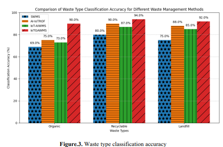 Figure 3 shows the comparative analysis of waste type classification accuracy among four different waste management methods: traditional SWMS, AI-IoTROF, IoT-AIWMS, and the proposed IoTGAWMS. Three waste typesβOrganic, Recyclable, and Landfillβare represented through bars for each method. The height of each bar denotes the percentage value of classification accuracy, while the labels at the bottom give the exact accuracy values. The chart indicates that the proposed IoTGAWMS is better than other methods, especially in recycling and landfill waste. It is readable with all different patterns and colours, as grid lines have been added to make comparing the method's results clearer.