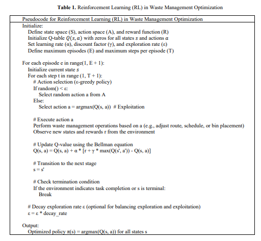 Reinforcement Learning (RL): Reinforcement Learning is a dynamic approach to optimizing waste management through adaptation to real-time changes, including unstable waste generation patterns, traffic conditions, and other environmental factors. In this case, RL treats waste management as a learning problem where an agentβthe waste management systemβinteracts with the environmentβcampus conditionsβto achieve optimal performance. It learns to make predictive decisions through constant analysis of historical and real-time data, such as adjusting collection routes, schedules, or bin placements. RL improves efficiency by dynamically adjusting operations to changed circumstances, reduces waste overflows and travel distances, and optimizes resource utilization. This adaptability ensures that waste management will stay responsive, sustainable, and efficient in the long run. Table 1 shows the Pseudocode for Reinforcement Learning (RL) in Waste Management Optimization.