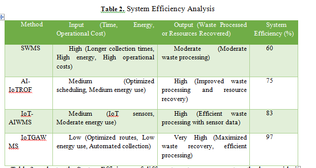 Table 2 evaluates the System Efficiency of different waste management methods, considering various inputs (time, energy, operational costs) and outputs (waste processed or resources recovered). The Traditional SWMS has high inputs with moderate efficiency, as it lacks optimization. AI-IoTROF improves efficiency with medium inputs, leveraging AI and IoT for better waste processing. IoTAIWMS shows further improvement in efficiency due to its use of IoT sensors for real-time data. The Proposed IoTGAWMS outperforms all others with the lowest inputs and the highest output, demonstrating superior efficiency through optimized routes, energy use, and automation in waste collection.
