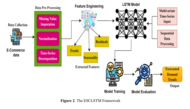 This paper, therefore, presents the proposed methodology, ESCLSTM, which will begin by gathering historical sales and inventory data from an open-source e-commerce dataset. Preprocessing includes handling missing values, normalizing features, and time-series decomposition. Modelling sequential dependencies is performed using the LSTM networks, with hyperparameters tuned via a grid search to optimize performance. The models are then evaluated using measures like Mean Absolute and Root Mean Square Error and compared to traditional methods like ARIMA. A multivariate LSTM model has also been developed to include more features, such as promotions and seasonal trends, to increase the accuracy of the prediction.The primary significance of the paper is