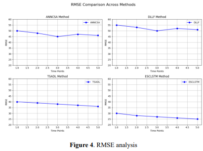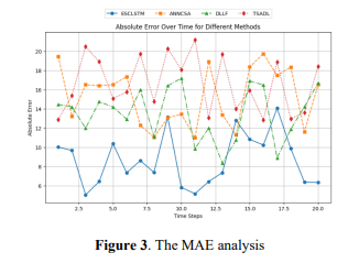 Figure 3 shows the MAE tendency of 20-time steps by using four methods: ESCLSTM, ANNCSA, DLLF, and TSADL. The error values for ESCLSTM are always the lowest, showing higher predictive accuracy. ANNCSA, DLLF, and TSADL have higher error levels, and TSADL has more variable error values. Comparisons show that ESCLSTM effectively reduced general absolute errors of non-linear and temporal patterns. This visualization points out the robustness and scalability of ESCLSTM in dynamic e-commerce supply chain environments for demand forecasting improvement.