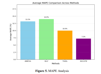 The ESCLSTM method is compared with the traditional approaches—Artificial Neural Networks with Capuchin Search Algorithm (ANNCSA) [10], Deep Logistic Learning Framework (DLLF) [13], and Time-Series Analysis with Deep Learning Techniques (TSADL) [16]. The comparison of them is further elaborated by the evaluation of performance on three metrics: mean absolute error, root mean square error and Mean absolute percentage error. All metrics give comprehensive insight into how good the prediction accuracy, error magnitude, and scalability across various e-commerce supply chain forecasting scenarios are.