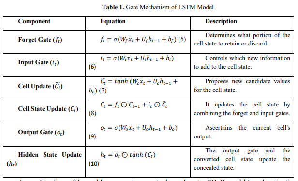 There are three gates in an LSTM cell that control the cell's hidden and present states: the Forget Gate, the Input Gate, and the Output Gate. The two states of LSTM cells are the cell state (𝐶𝑡 ) and the secret condition (ℎ𝑡 ). The network's memory is the cell state; it retains information over extended periods. The model's output results from several parts, one of which is the hidden state, which stores important information from one time step and passes it on to the next. Because of these, the LSTM can model interdependencies in sequential data inthe short and long term. The LSTM model's gate mechanism is displayed in Table 1. The LSTM model's gate performance is seen in equations 5–10.