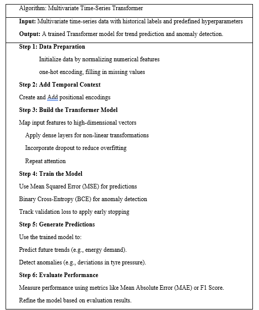 The Multivariate Time-Series Transformer predicts multidimensional trends and detects anomalies. First, the information is normalized, a single-hot encoded, and values that are missing are addressed. A positional encoded information improve time-series data organization by adding chronological perspective. The mathematical framework maps characteristics with numerous layers, drops out overfitting, and captures feature interactions with methods of attention. It receives instruction with Mean Squared Error for tendencies and Binary Cross-Entropy for abnormalities, halting promptly with validating losses. Effectiveness is measured by Mean Absolute Error and F1 Score for trend prediction and anomaly detection.