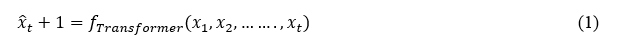 Given a time-series dataset X=[x_1,x_2,…….,x_t], where x_t Is the feature vector at time t, the Transformer model predicts the next time step value x_t+1: