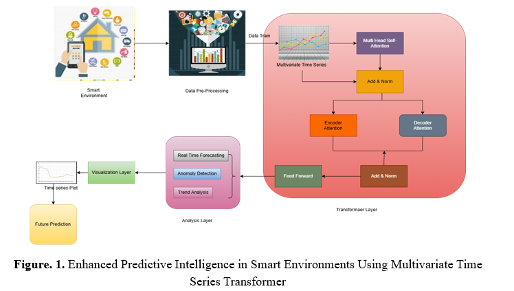 In intelligent settings, the network's design describes a chain of processes that handles information and makes predictions. Things like heating and cooling systems, power management software, and driving assistance technologies are examples of IoT devices that gather multimodal data in time series. The preconditioning procedure data helps with noise removal, missing information handling, and trustworthiness guarantees. A Transformer-based framework receives the cleaned-up material. Anomalies and anticipates trends instantaneously, encoder-decoder sections examine relationships between data elements, and multi-head self-awareness collects chronological connections. The dashboards show information, anomalies, and trends that may be used for proactive intelligence gathering in a graphical overlay. Finally, the System has a module for predicting the future, which provides reliable predictions to help intelligent surroundings make choices.