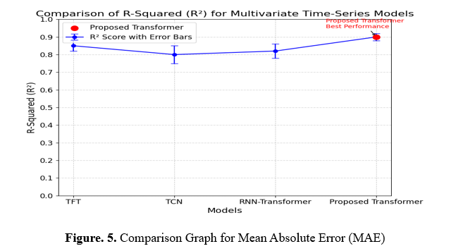 Based on their R-squared (R²) scores, the graph compares the performance of four models: TFT, TCN, RNN-Transformer, and Proposed Transformer. A higher value suggests a more accurate prediction, as it shows how well each model matches the dataset. Events from multiple categories, with varying frequencies of occurrence, are included in the dataset. These categories include Air Conditioner, Energy Management, and Signal Lighting. With the greatest R² score, the Proposed Transformer model outperforms the competition and can better capture temporal patterns across all these data types. This benefit is graphically shown in the graph with comments and error margins.