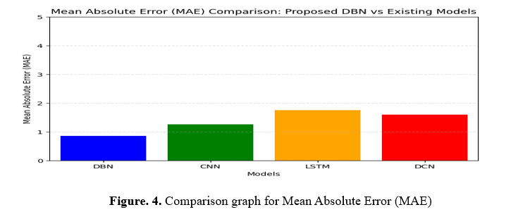 The structures and MAE values are defined initially. Employing this bar graph shows algorithms on the X-axis and values of the MAE on the Y-axis. The Y-axis length is 0 to 5, and the X-axis range displays every design accurately. Lastly, an illuminated grid across the Y-axis improves MAE comparative visibility.