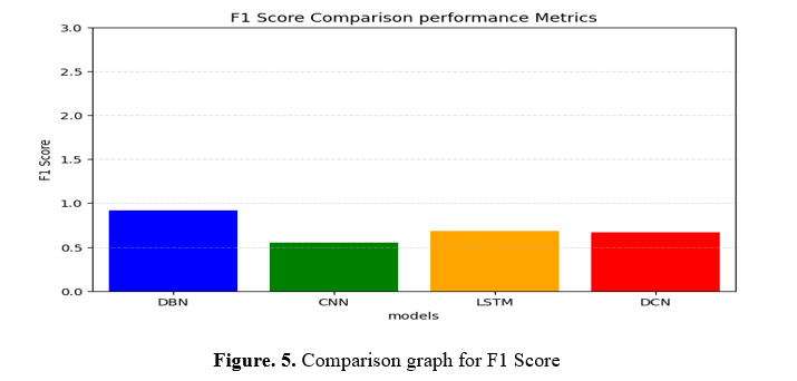 It creates a bar graph evaluating the DBN model's F1 Score to CNN, LSTM, and DCN algorithms. It specifies the equations and F1 scores and then makes a bar graph with Matplotlib. Designs are on the X-axis, and F1 scores are on the Y-axis, with values ranging from 0 to 5. For simplicity, axis symbols and titles are provided. Each model fits comfortably in the X-axis range, and a Y-axis matrix enhances comprehension. This visualization allows for comparing the effectiveness of models using the F1 Score.